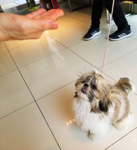 あみちゃんは今回で3回目の参加で、ハンドターゲットやアイコンタクト、おすわり・ふせの練習をしました。