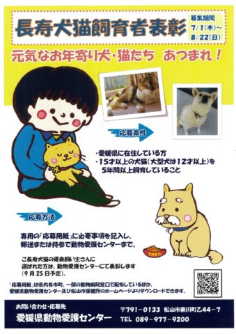 愛媛県動物愛護センターより「長寿犬猫飼育者表彰」と「ペット写真コンクール」の募集を行っています。