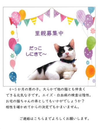 大らかで他の猫ちゃんとも仲良くできる元気な子です。