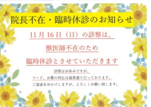 2025年11月16日(日)は獣医師不在のため、休診とさせていただきます。