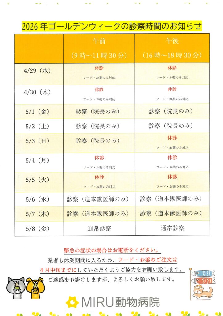 業者もお休みに入るため、お薬・フードの注文は早めにお願い致します。