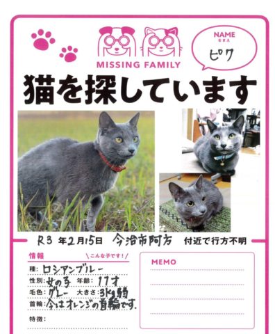 2月15日にロシアンブルーの女の子(11歳)が今治市阿方付近で行方不明となりました。(詳細は画像参照)