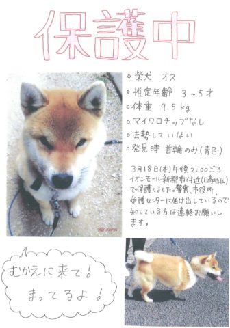 2021年3月18日午後2時頃にイオンモール新都市付近(日高地区)で推定3~5歳の柴、男の子を保護された方がいます。